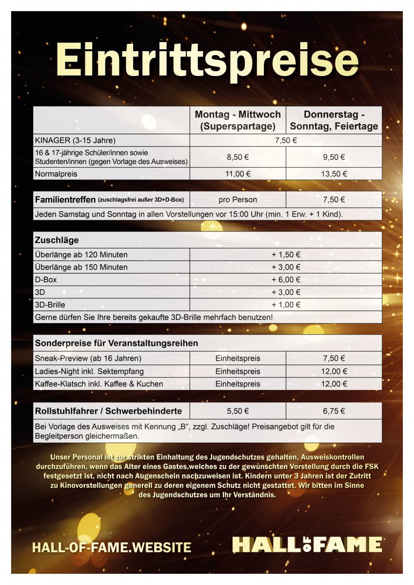 Auf ermäßigte Preise sind keine zusätzlichen Rabatte möglich. Mehrere Rabatte sind nicht miteinander kombinierbar. Preise für Sondervorführungen & Veranstaltungen/Rabattprogramme können individuell geregelt sein.